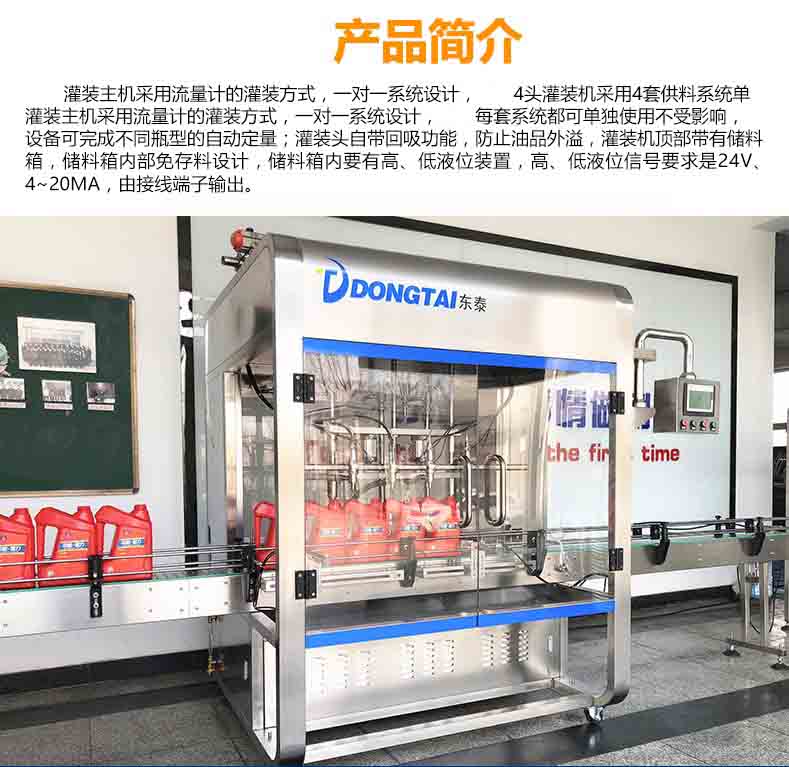 全自動(dòng)潤滑油灌裝主機采用流量計的灌裝方式,一對一系統設計,4頭灌裝機采用4套供料系統單灌裝主機采用流量計的灌裝方式