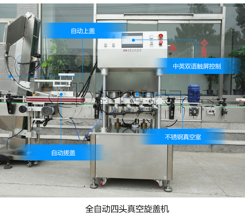 該生產(chǎn)線(xiàn)適合中小口徑三旋、四旋玻璃瓶調味醬的分裝,適合醬料、含顆粒黏稠物料的灌裝,物料接觸部分均采用316不銹鋼,整機304不銹鋼,符合食品衛生標準。該機設計合理,機型小巧,立式結構,節省場(chǎng)地,操作方便。啟動(dòng)部分均采用FESTO和臺灣AirTack的氣動(dòng)元件。灌裝閥有氣動(dòng)閥控制,灌裝精度更高,灌裝量和灌裝速度均可任意調整,灌裝悶頭采用防拉絲及升降灌裝裝置。