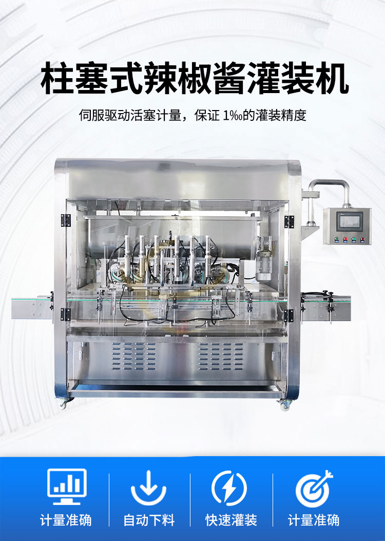 辣椒醬灌裝機采用活塞式灌裝原理,適用于調味品中帶顆粒并且濃度較大的辣椒醬、豆瓣醬、花生醬、香菇醬、果醬、牛油火鍋底料、紅油火鍋底料、蝦醬等較為粘稠醬類(lèi)的灌裝。
