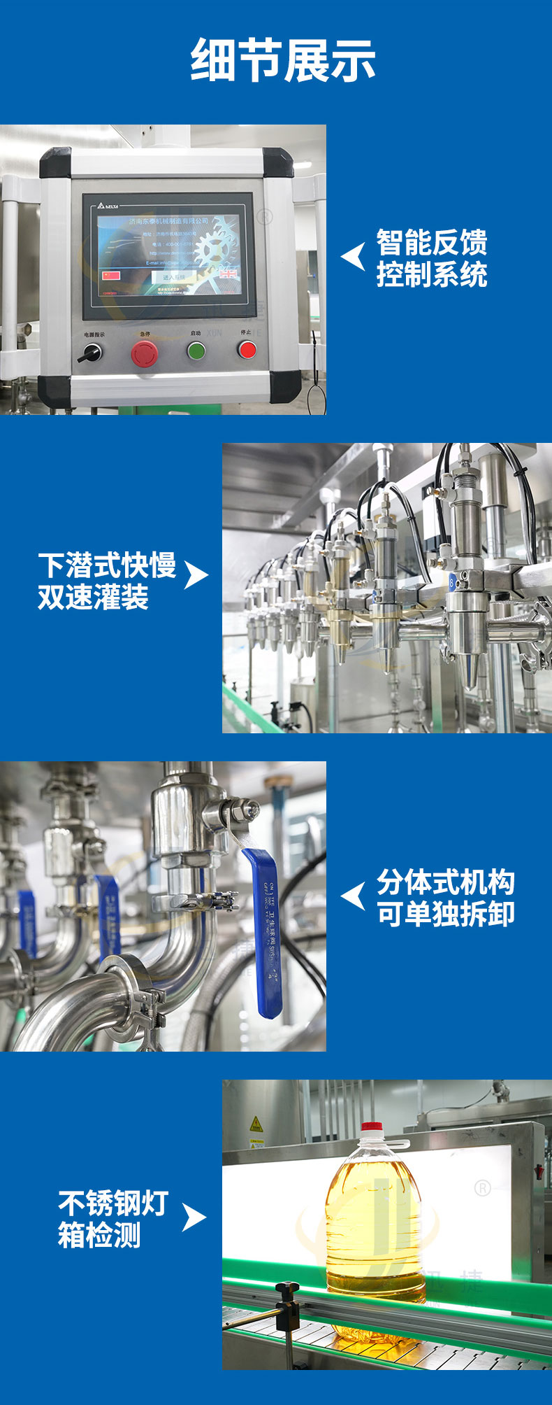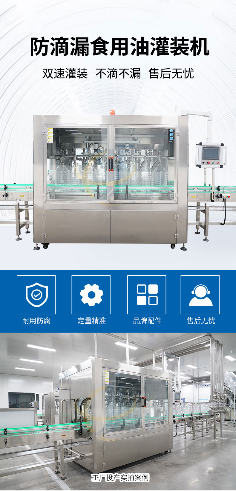 全自動(dòng)八頭食用油灌裝機單頭單泵單變頻控制,容積和質(zhì)量?jì)煞N計量方式自由轉換,灌裝調節方便快捷。