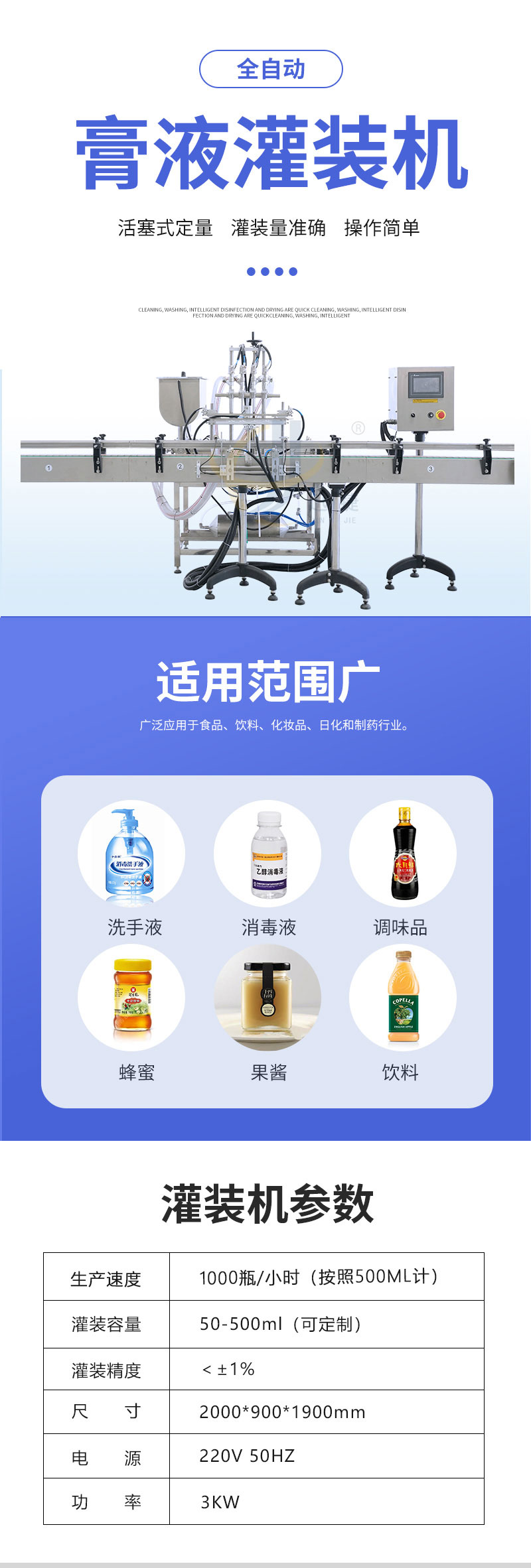 全自動(dòng)膏液灌裝機適用于食品、飲料、化妝品、日化和制藥行業(yè)。灌裝頭設有特殊防漏裝置,灌裝無(wú)拉絲,滴漏現象。
