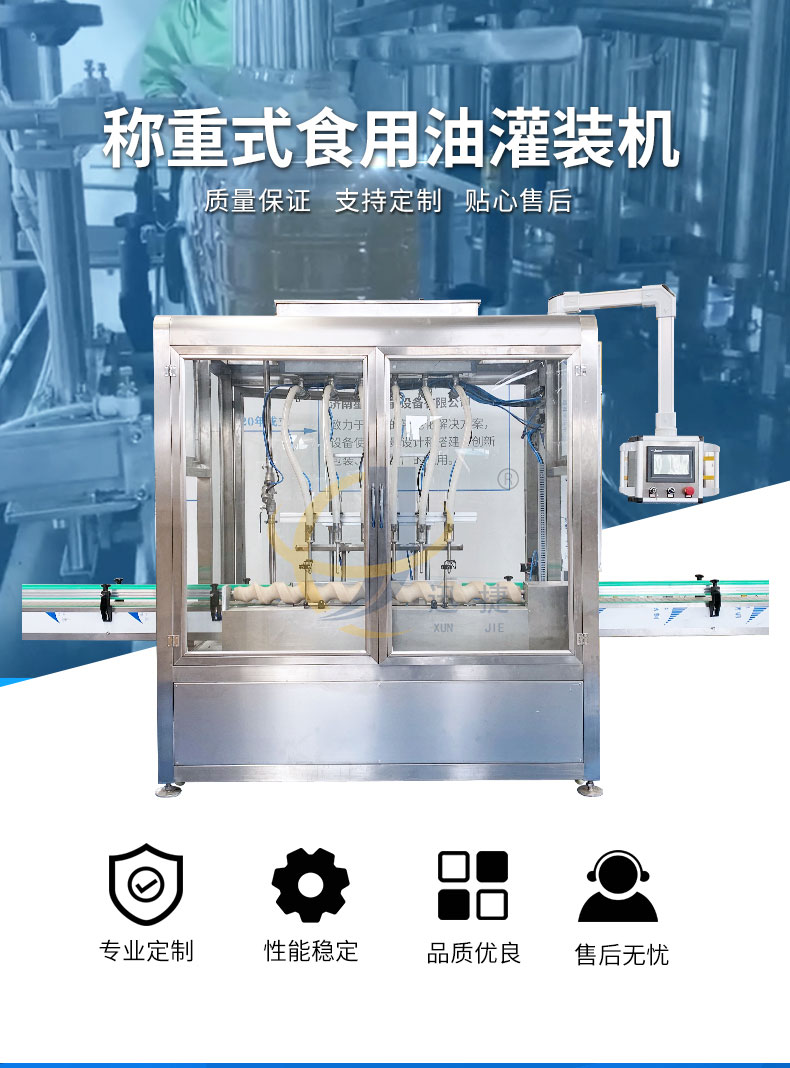 全自動(dòng)食用油灌裝機適用于玻璃瓶、PET瓶、PP桶都可以灌裝。包裝規格:500ml、900ml1.6L、4L、5L、8L、10L、18L。