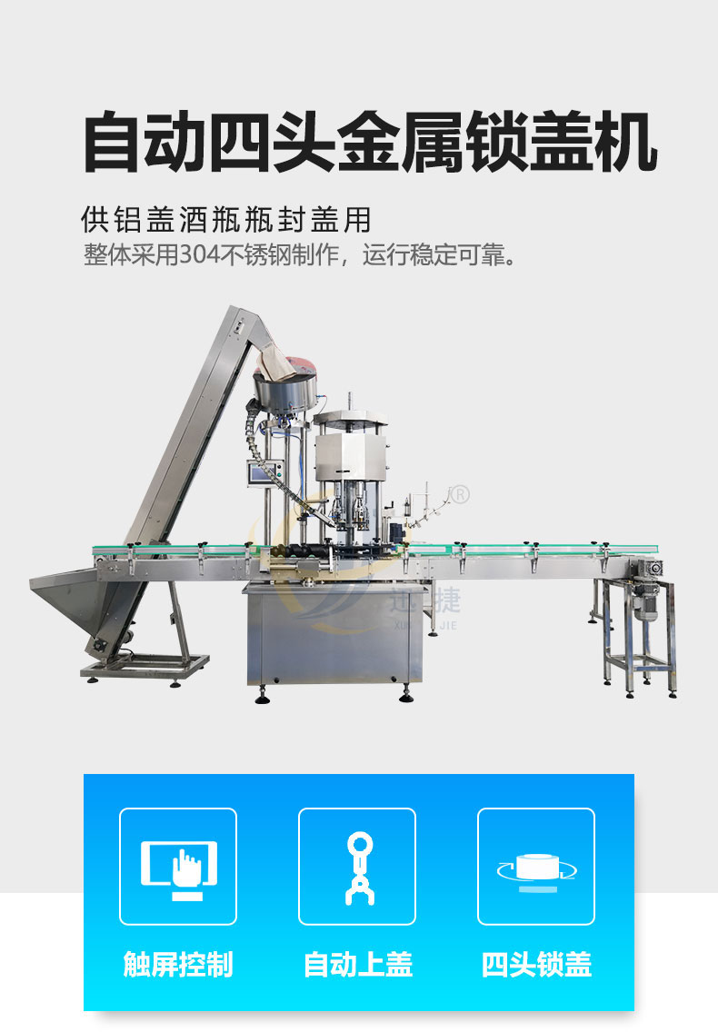 全自動(dòng)四頭金屬鎖蓋機供鋁蓋酒瓶瓶封蓋用,整體采用304不銹鋼制作,運行穩定可靠。適用于50-100ml各類(lèi)圓瓶、方瓶等瓶型旋蓋。