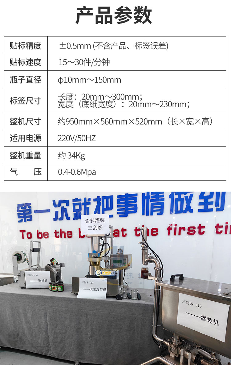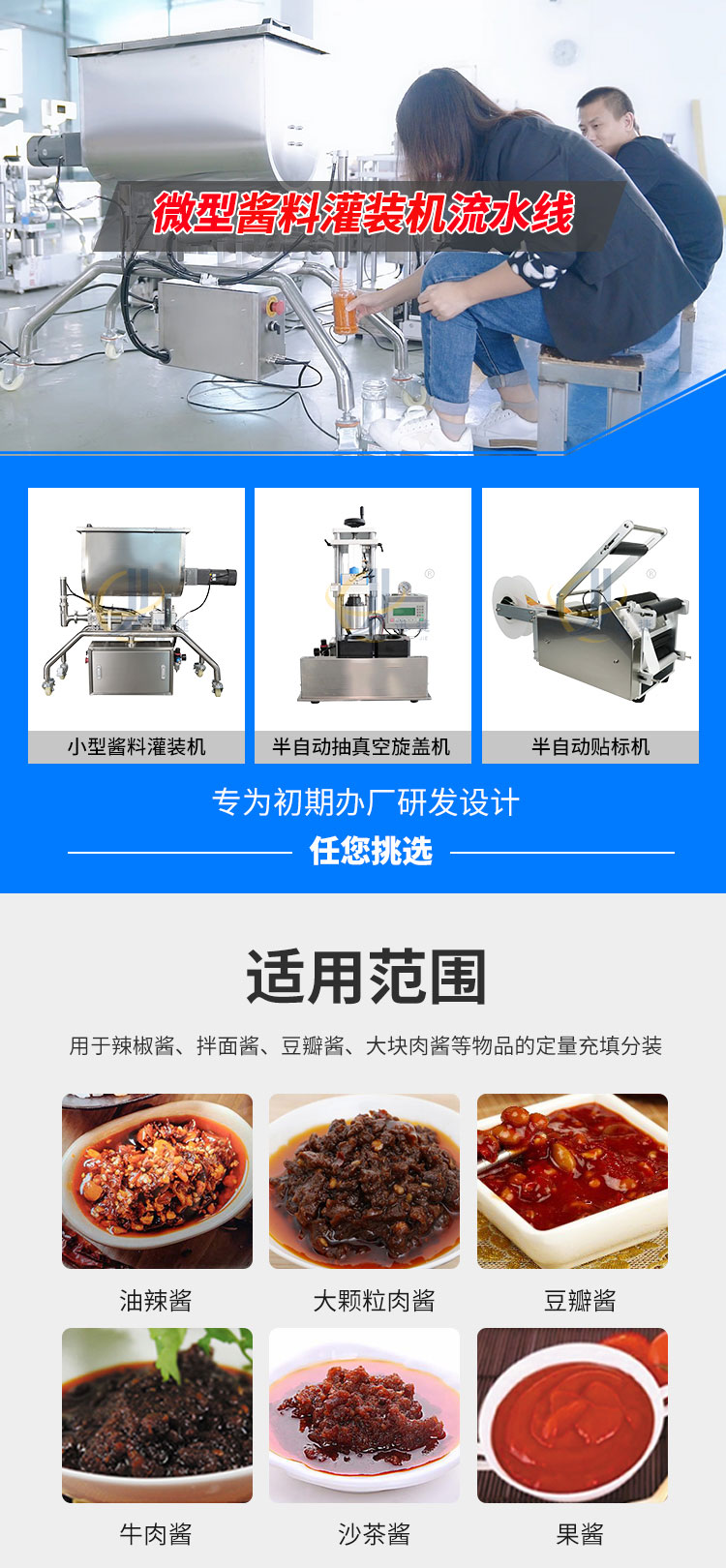 小型醬料灌裝生產(chǎn)線(xiàn)又名醬料灌裝三劍客,由半自動(dòng)醬料灌裝機+半自動(dòng)真空旋蓋機+半自動(dòng)圓瓶貼標機組合而成。