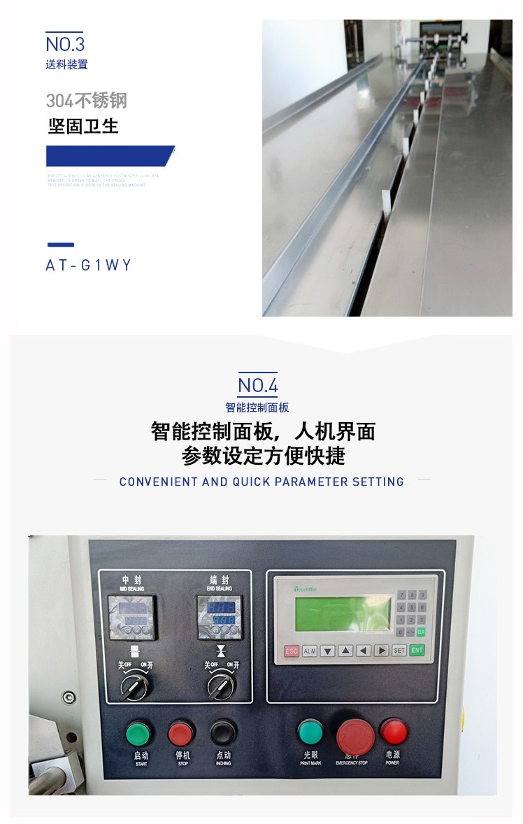 C、先進(jìn)的微電腦包裝控制器,優(yōu)良的人機對話(huà)模式,使速度、袋長(cháng)、切點(diǎn)位置檢測等都可在界面上直接顯示。