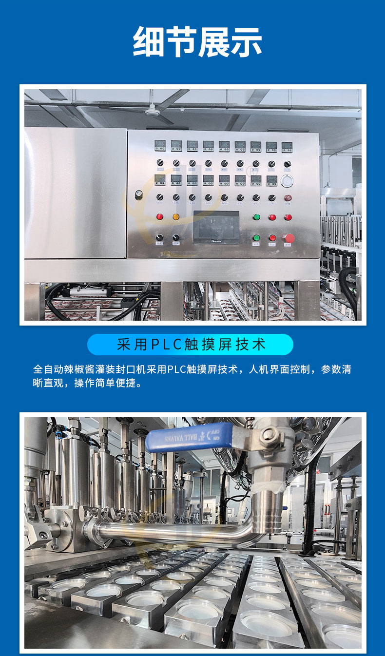 杯裝辣椒醬灌裝封口機適用于辣椒醬、黃豆醬、豆瓣醬、牛肉醬、沙拉醬等各種杯裝、盒裝等產(chǎn)品的生產(chǎn)。