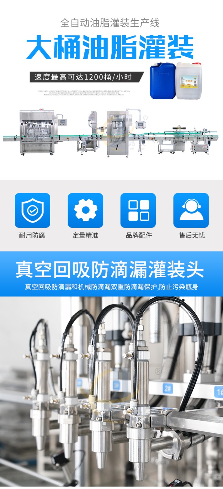 全自動(dòng)油脂灌裝生產(chǎn)線(xiàn)適用于灌裝各種油類(lèi)及粘稠液體,如花生油、調和油、菜籽油等食用油的灌裝??筛鶕嘌b需求定制機型。