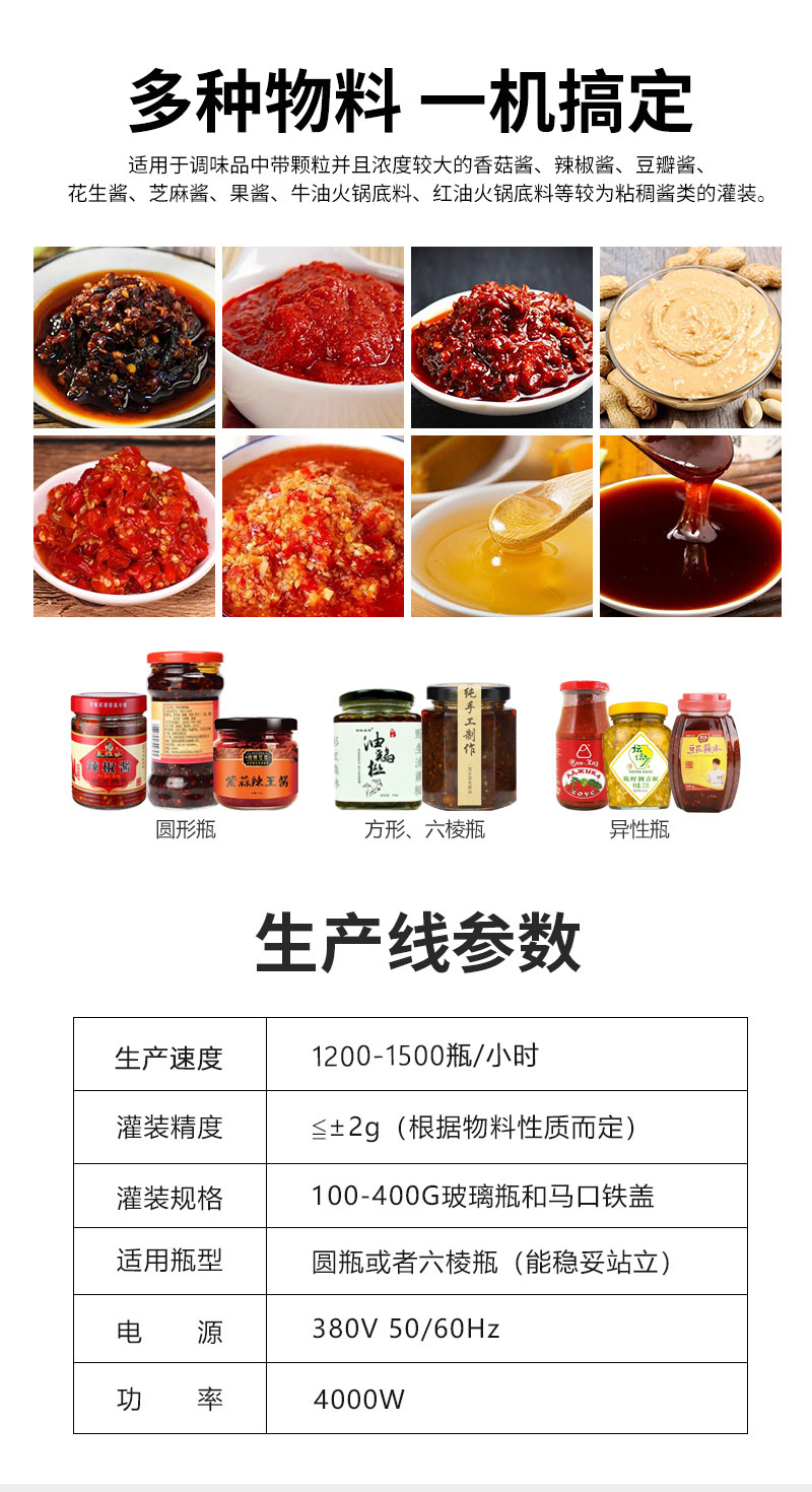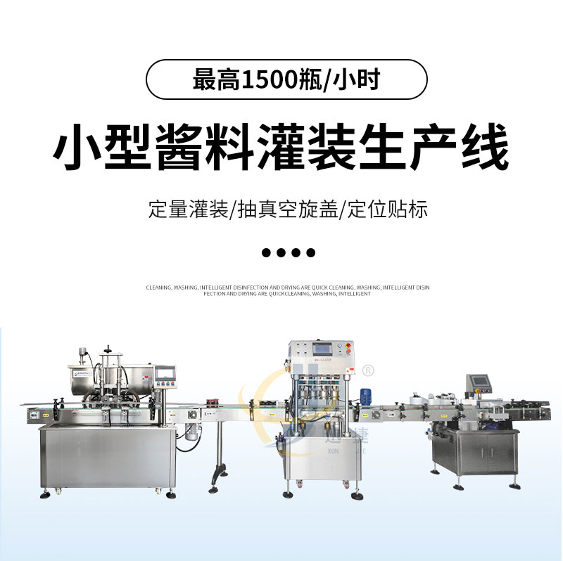 小型醬料灌裝生產(chǎn)線(xiàn)適用于調味品中帶顆粒并且濃度較大的香菇醬、辣椒醬、豆瓣醬、花生醬、芝麻醬、果醬、牛油火鍋底料