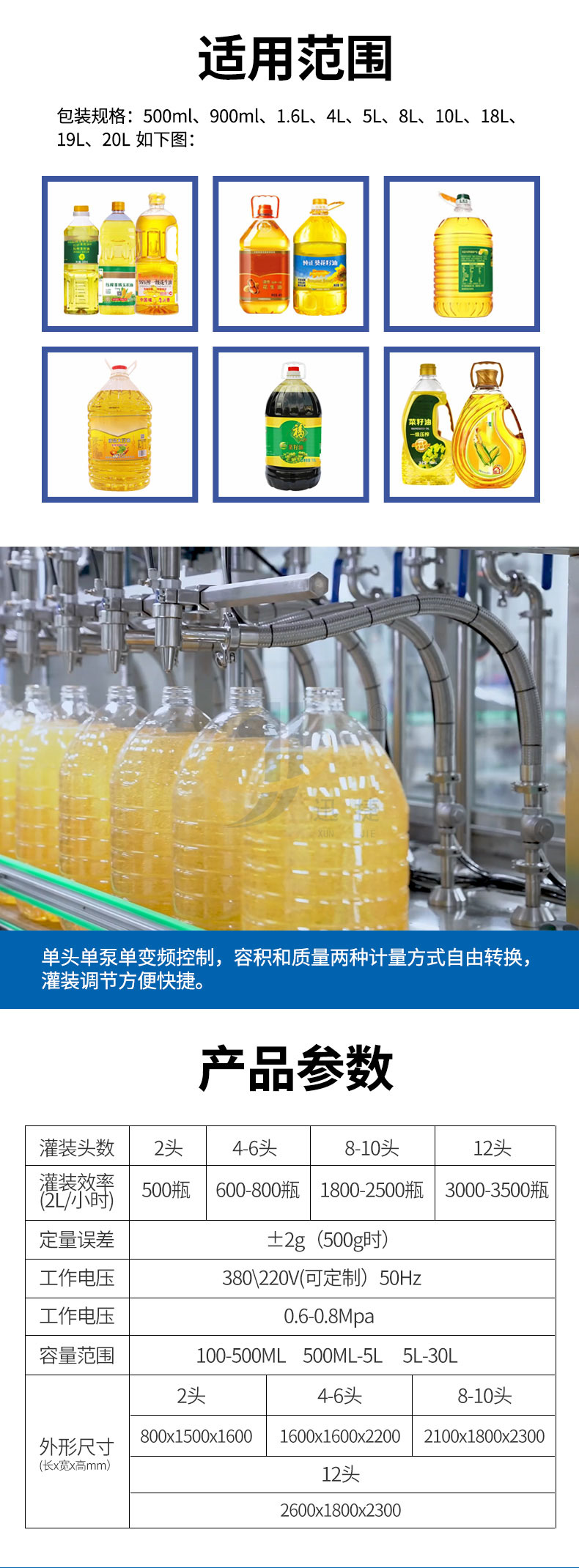 全自動(dòng)八頭食用油灌裝機單頭單泵單變頻控制,容積和質(zhì)量?jì)煞N計量方式自由轉換,灌裝調節方便快捷。