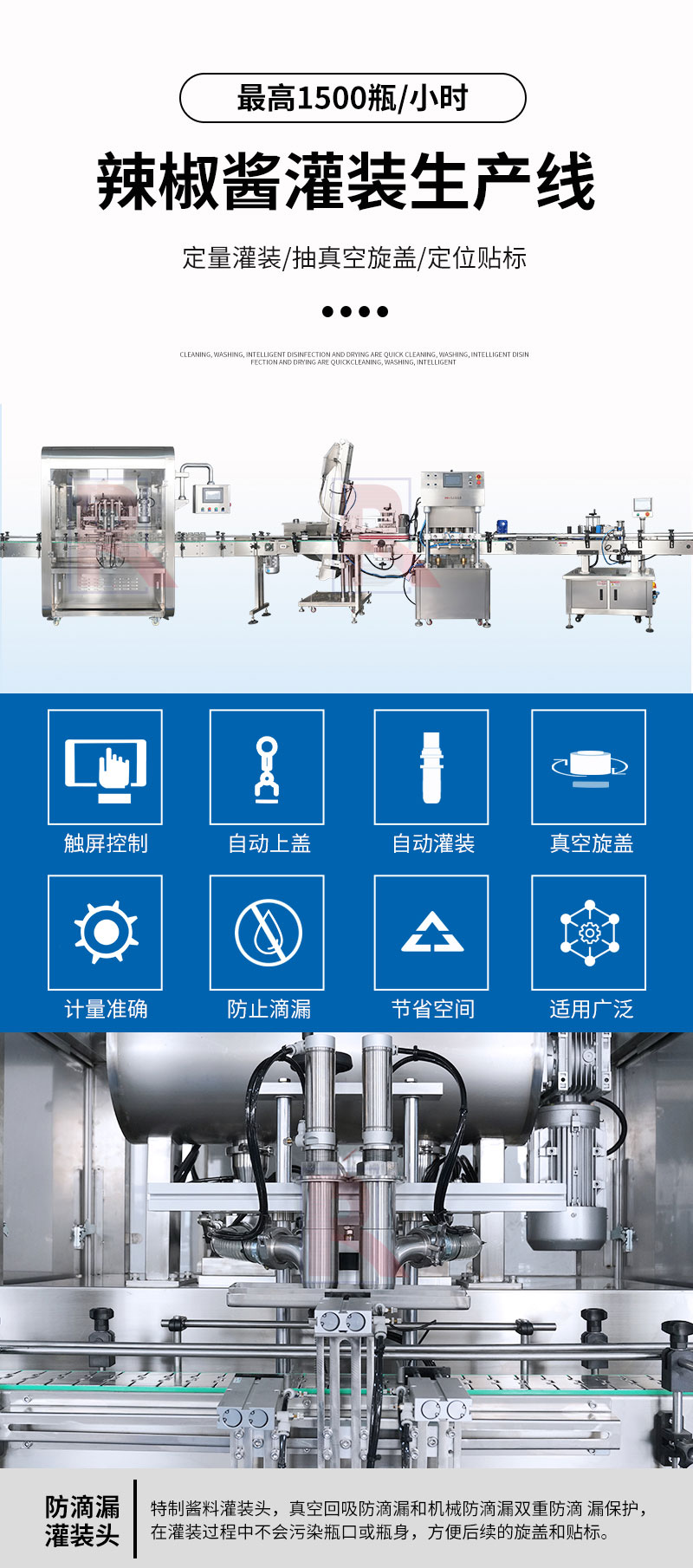 雙頭辣椒醬灌裝生產(chǎn)線(xiàn)適用于調味品中帶顆粒并且濃度較大的香菇醬、豆瓣醬、花生醬、芝麻醬、果醬、牛油火鍋底料等醬類(lèi)的灌裝。
