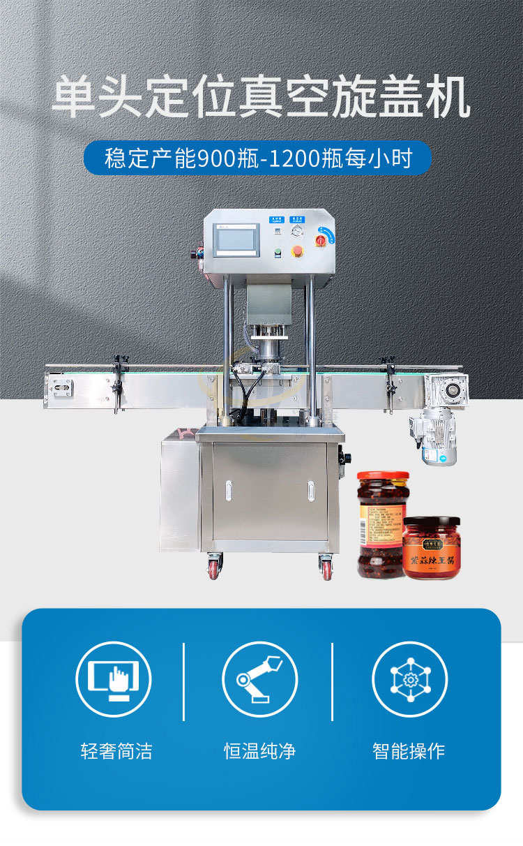 單頭定位真空旋蓋機適用多種瓶型。通過(guò)更換模具,即可適合于不同形狀、尺寸瓶子的真空旋蓋,換產(chǎn)方便。