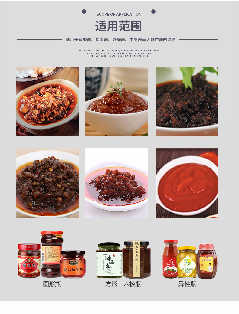 雙頭高速醬料灌裝機適用于調味品中帶顆粒并且濃度較大的辣椒醬、豆瓣醬、花生醬、香菇醬、果醬、牛油火鍋底料。