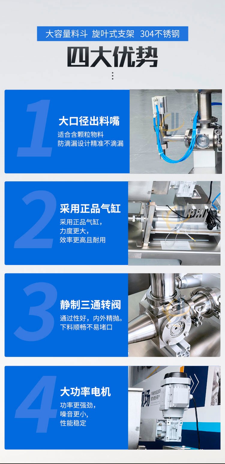 本灌裝機采用臺灣正品亞德客氣缸,力度更大,效率更高!超大不銹鋼料斗,帶自動(dòng)攪拌功能,保證灌裝產(chǎn)品,使產(chǎn)品灌裝更加均勻!灌裝嘴采用鋼精制成,精確灌裝不堵塞,防滴漏設計帶產(chǎn)品自提功能,灌裝更準確!
