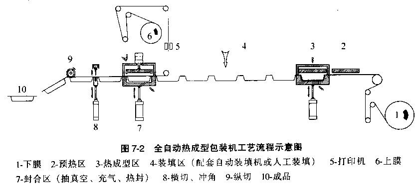 包裝的全過(guò)稅由機器自動(dòng)完成,根據需要,裝填可采用人工或機械實(shí)現。內流程圖可見(jiàn),下卷膜經(jīng)牽引以定步距步進(jìn),經(jīng)預熱區及加熱區,由氣壓、真空或沖模成型,在裝填區填充物料后進(jìn)入熱封區。在熱封區中,上卷膜經(jīng)導輥后覆蓋在成型盒上,視包裝需要可進(jìn)行抽真空或充入保護氣體的處理,然后進(jìn)行熱壓封合。后經(jīng)橫切、縱切及切角修邊形成一個(gè)個(gè)美觀(guān)的包裝成品。至于經(jīng)裁切后的邊料可由抽吸捅或卷?yè)P裝置收集和清理。